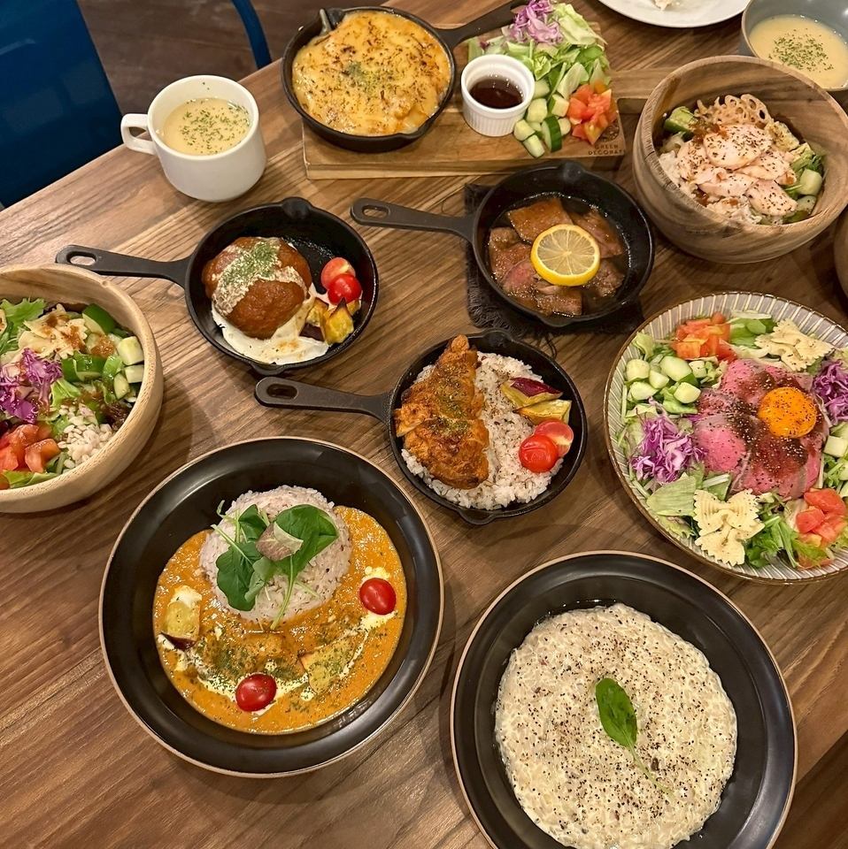全てのフードメニューにサラダ、スープが付いております。ハンバーグやバターチキンカレー、21穀米を使用しております。GREEN DECORATE自慢のサラダと一緒にお召し上がりください。